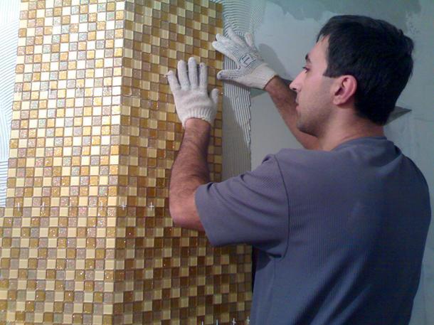 Stick auf Trockenbau, Holzoberfläche, die Basis von Spanplatten, Fensterbank oder Sperrholz solche Fliesen können auch sein. Die Hauptsache ist, dass die Basis vorbereitet, grundiert und gereinigt werden sollte. Kleben Sie das Mosaik von unten beginnend an. Zum Abstreichen ist die Rückseite der Fliese optional. Genug von dem Kleber, der an der Wand hängen wird. Auf keinen Fall kann man nicht nach oben drücken, um besser zu reparieren. Wenn Sie das Mosaik schneiden müssen, versuchen Sie, diese Fragmente beim Verlegen von Ecken und anderen Stellen zu verwenden, die nicht so gut sichtbar sind.