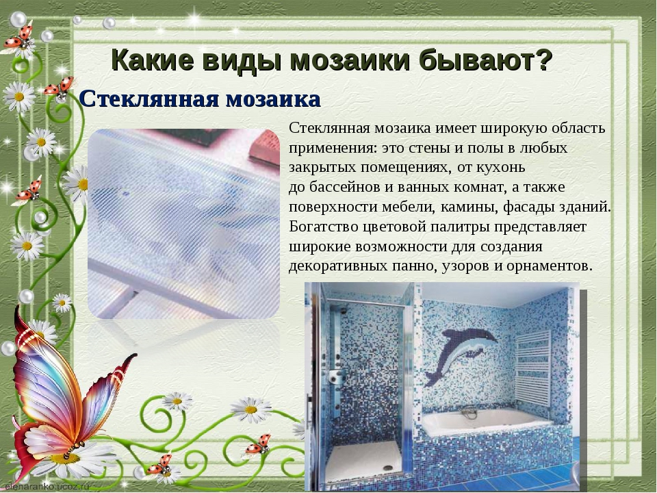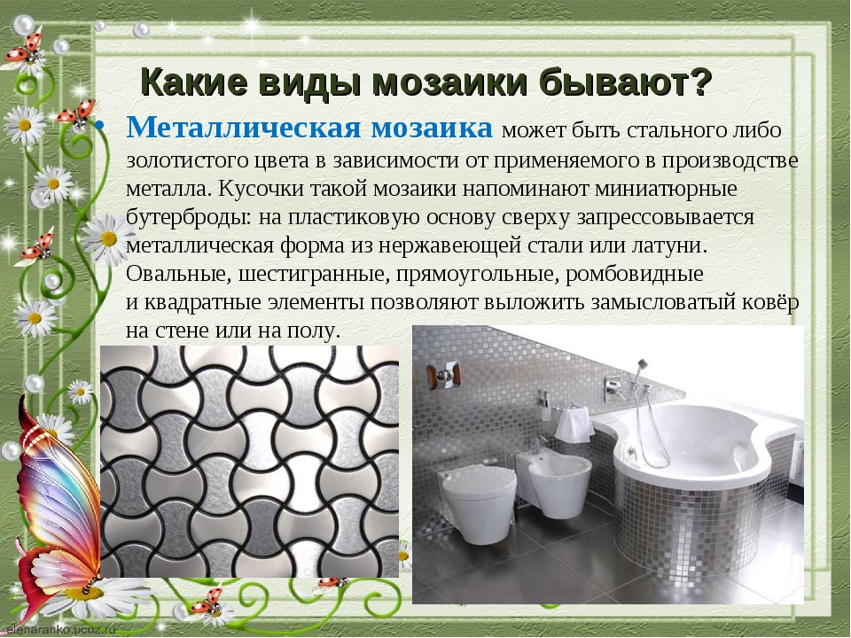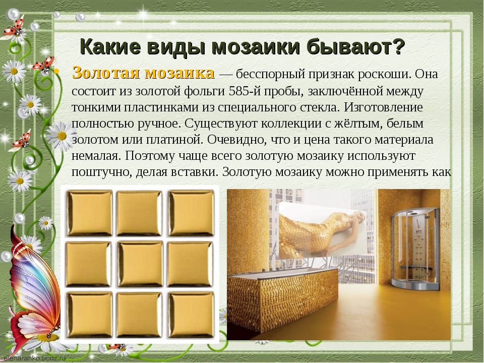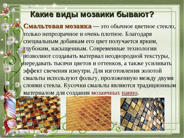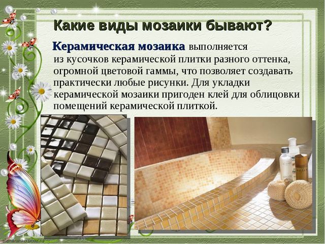 - Die beliebteste Art ist Fliesen oder Keramikfliesen. Wie bei herkömmlichen Fliesen ist die Mosaikoberfläche unterschiedlich. Es kann eine matte, glänzende, raue, perlglänzende Oberfläche sein. Die Farbpalette überrascht angenehm, so dass Sie nicht nur klassische Farbtöne, sondern auch interessante Farbkombinationen wählen können.Diese Art von Fliesen kann in einer Vielzahl von Bereichen verwendet werden. Es ist für die Dekoration von Decken, Wänden oder Fußböden, Dekoration der Fassade, Kamin verwendet. Das Material ist sehr vielseitig und daher sehr gefragt.