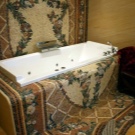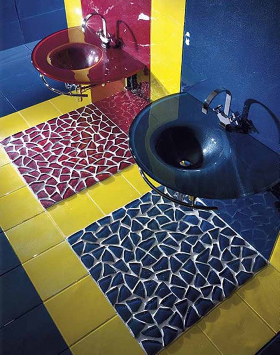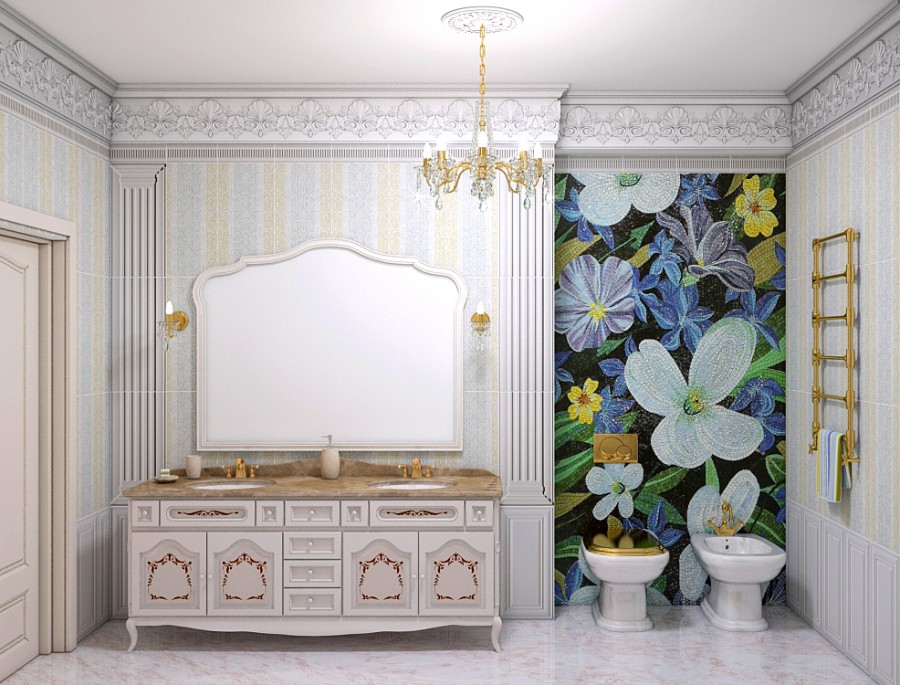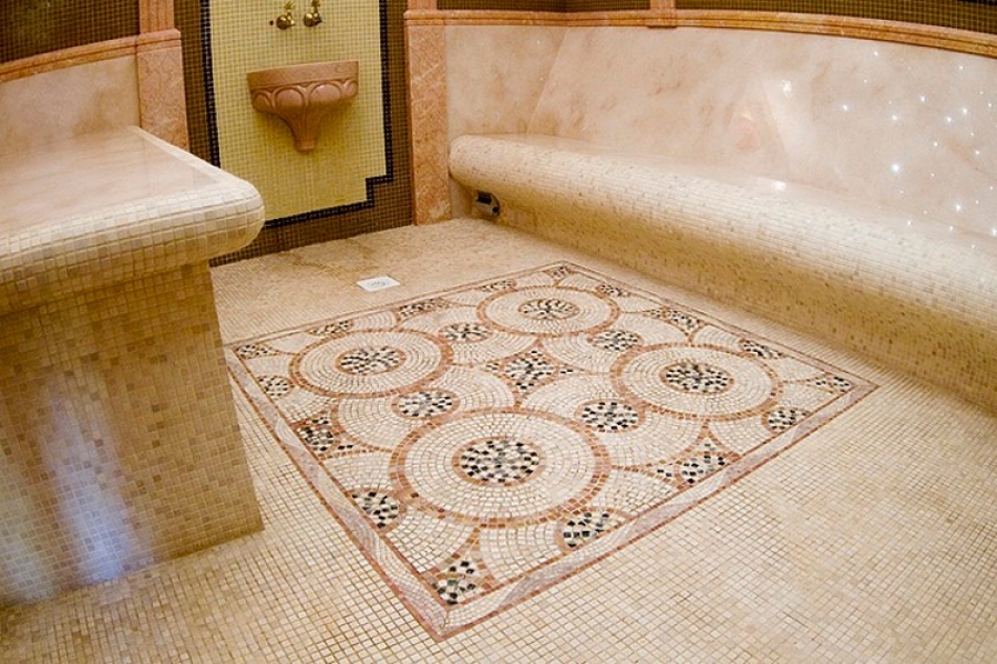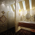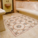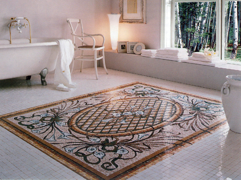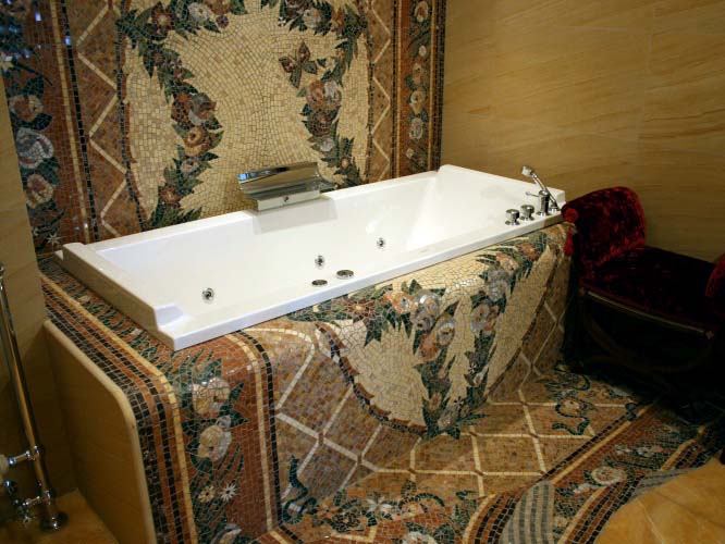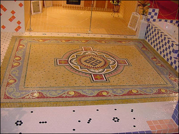Sehr interessante Böden mit Bildern, die Teppiche oder Teppiche nachahmen. Sie können sich in der Mitte des Raumes neben den Waschbecken befinden oder den Boden der Dusche schmücken.Unglaublich beeindruckend und realistisch aussehende Teppichmuster aus Mosaik, fließend von der Wand bis zum Podium mit einem eingebauten Badezimmer und dann auf den Boden.