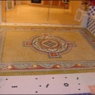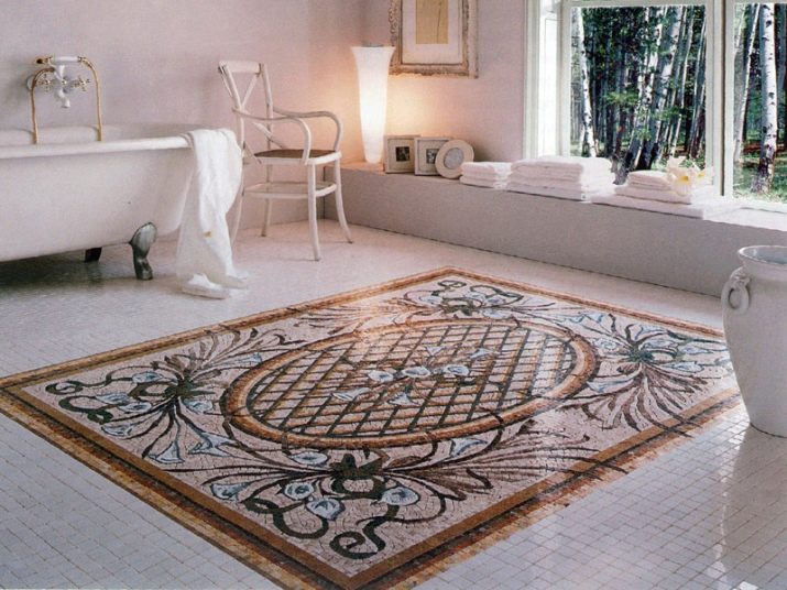 Für ihr Styling wasserdichter Epoxidkleber verwendet. In diesem Fall wird bei der Vorbereitung der Basis ein Zementestrich hergestellt und eine Abdichtung wird angeordnet. Die Installation des Bodenmosaiks erfolgt aus der Mitte des Raumes.
