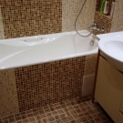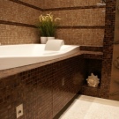 - Wenn Sie eine Schürze um die Badewanne machen, aus der Sie dann dünne Mosaikstreifen unterschiedlicher Länge auf die Wand und auf den Boden legen, können Sie die Geometrie des Raumes optisch verändern. Verbessert den visuellen Effekt und belebt einen solchen Design-Kontrast von Einsätzen aus einem glänzenden Mosaik eines dunklen Farbtons vor dem Hintergrund von Wänden und einem Boden von einer hellen Fliese mit einem zarten Perlglanz-Glanz unglaublich.