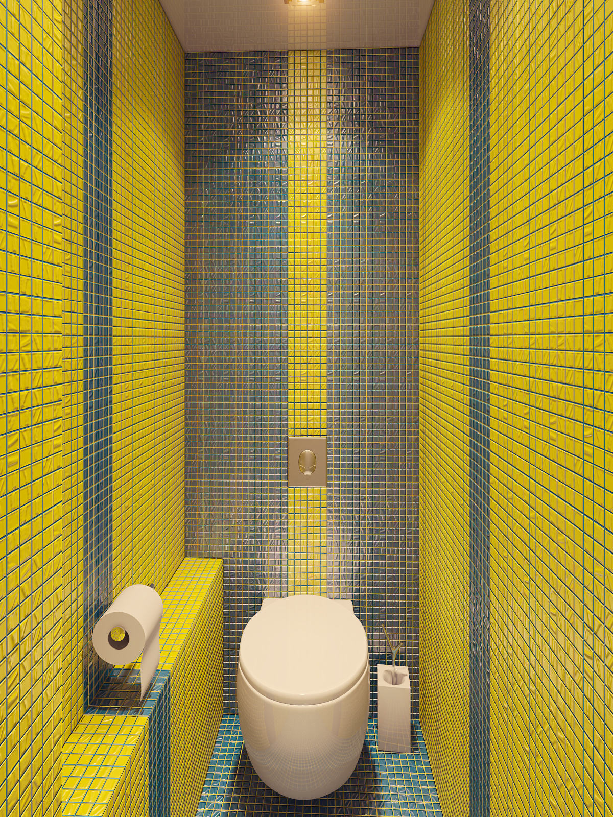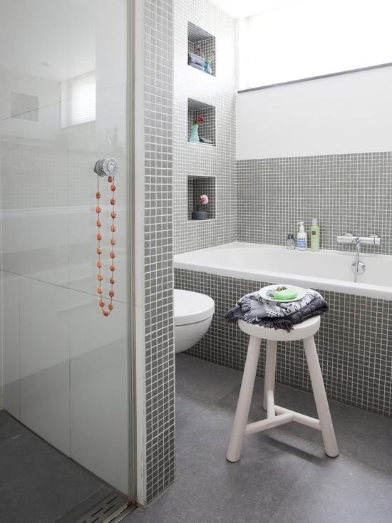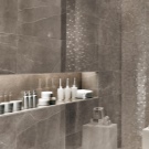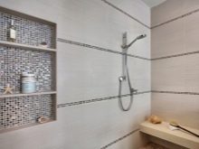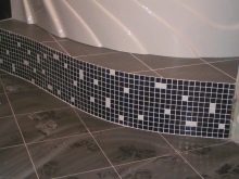 - Einfache und gleichzeitig elegante, horizontale Streifen aus Pech verschiedener Farbtöne, die um den Umfang der Wände gelegt wurden, in Kombination mit der Hintergrunddekoration aus hellen großformatigen Keramikfliesen und einer flachen Nische, die mit dem gleichen Mosaik ausgeschlagen wurde, das für Streifen verwendet wurde.