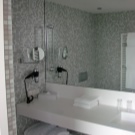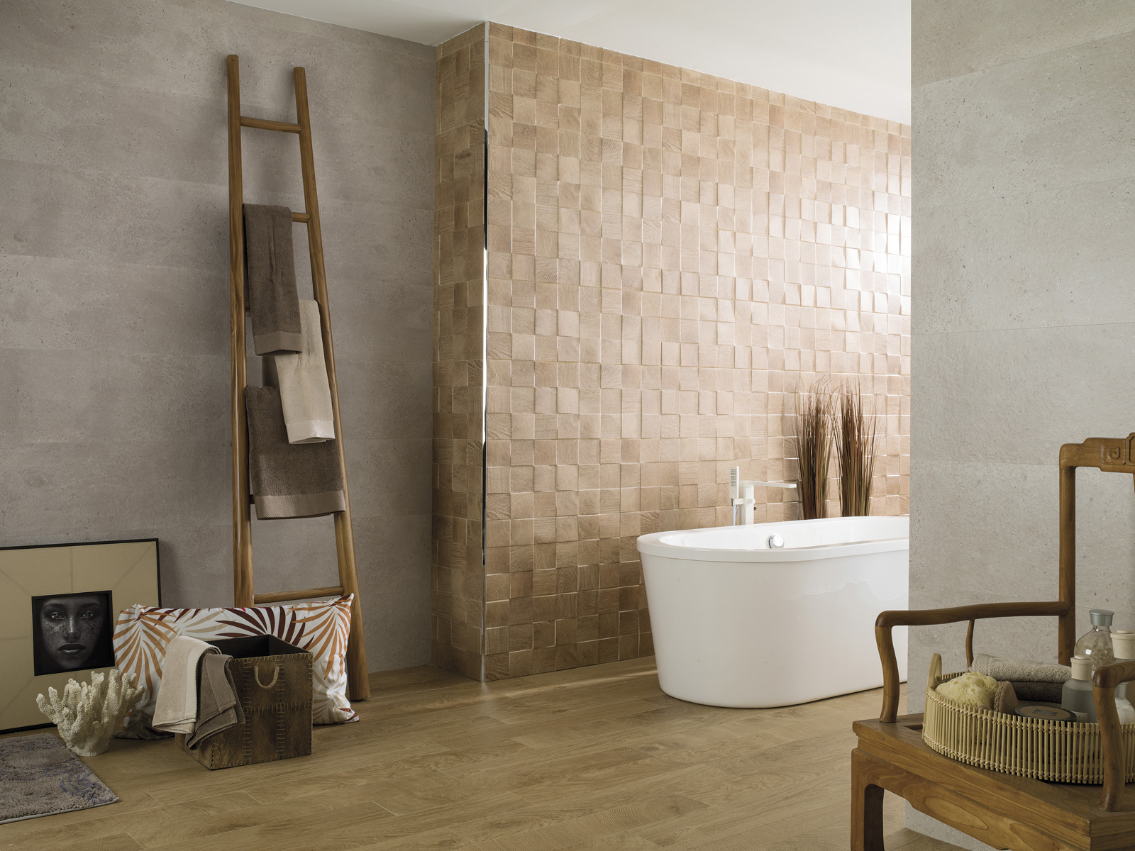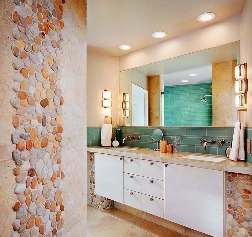 - Die Kombination einer Mosaikfliese mit einer Natursteinkieselbeschichtung in kleinem Format verleiht dem Raum ein stilvolles Aussehen und erhöht den Grad an Wärme und Komfort durch die Verwendung natürlicher Materialien.