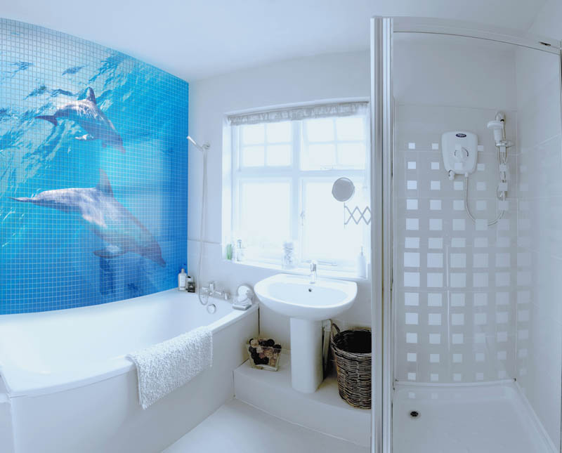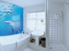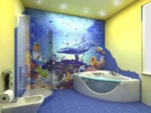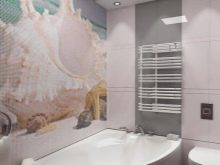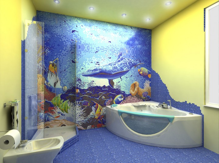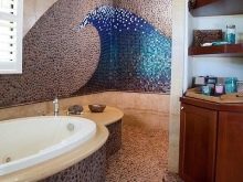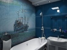 - Ein Mosaik-Panel mit Vertretern der Flora und Fauna der Unterwasserwelt oder Meeresschauplätze ist eine weitere effektive Möglichkeit, Bäder zu dekorieren, die Liebhaber des immer aktuellen, frischen und leichten nautischen Stils werden sicherlich den Geschmack mögen.