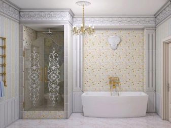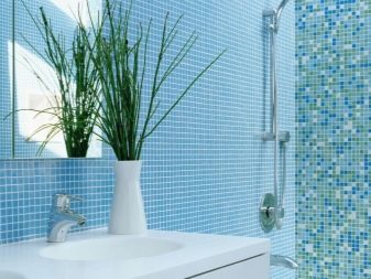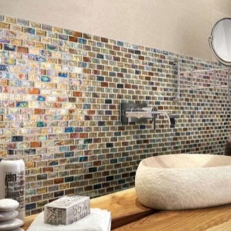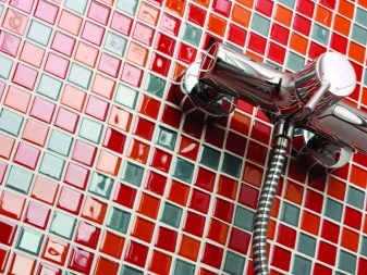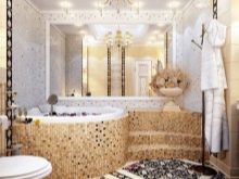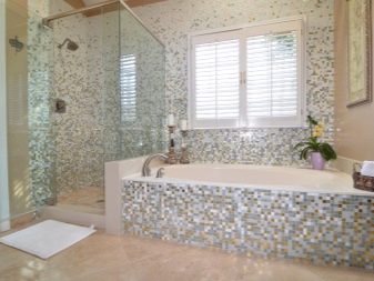 Mosaic "montieren" am selben Ort, wo sie produzieren. Verkaufen Sie Matrizen in Form von herkömmlichen Netzen oder Papierbögen mit eingeklebten "Mosaiken". Mosaikdetails werden einfach Chips genannt. Dieses Material vereint alle Vorteile von Fliesen, Zuverlässigkeit und Haltbarkeit, zu denen das ursprüngliche Design hinzugefügt wird, und das ist wichtig, wenn es um teure Badezimmer-Innenlösungen geht.
