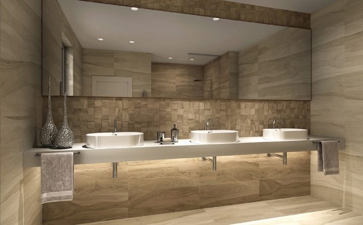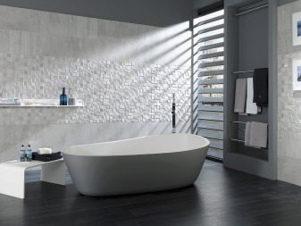 Es stimmt, das großformatige Setzmaterial hat die Fähigkeit, den Raum optisch zu verengen, indem es dem Volumen illusorisch beraubt wird. Es lohnt sich, die Besitzer von kleinen Badezimmern mit niedrigen Decken zu beachten.
