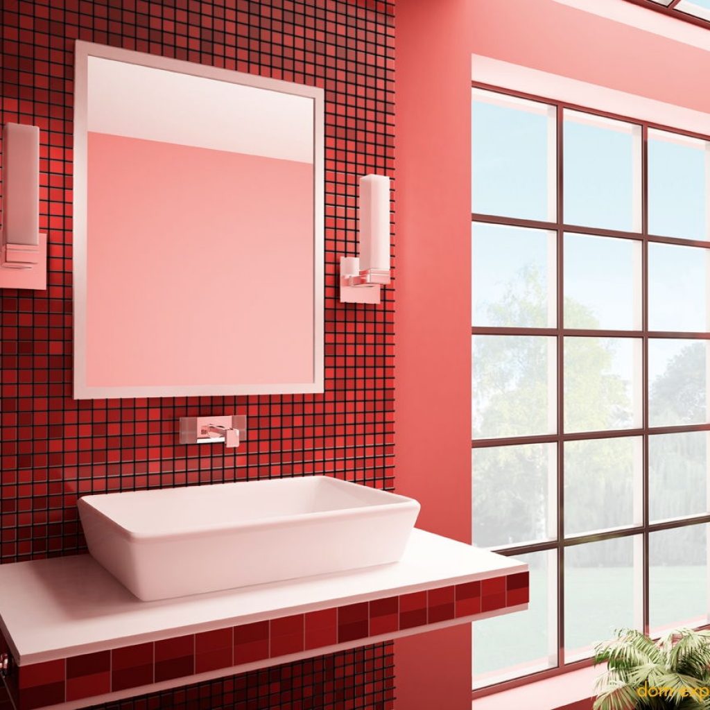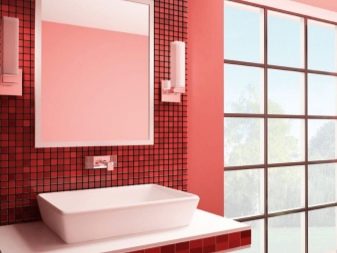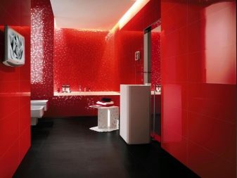 Helle und luxuriöse rote Palette wird aktiv verwendet, wenn Badezimmer mit Mosaiken verziert werden. Ihre Schattierungen werden mit den meisten Farben kombiniert und bilden spektakuläre Kombinationen, die am erfolgreichsten mit Abstufungen von Blau und Creme sowie mit Goldtönen sind.