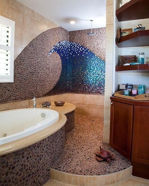 - Das Badezimmer ist unglaublich schön und ungewöhnlich, wo ein Teil der Wände und Möbelelemente mit Meereskieselmosaiken ausgekleidet sind.
