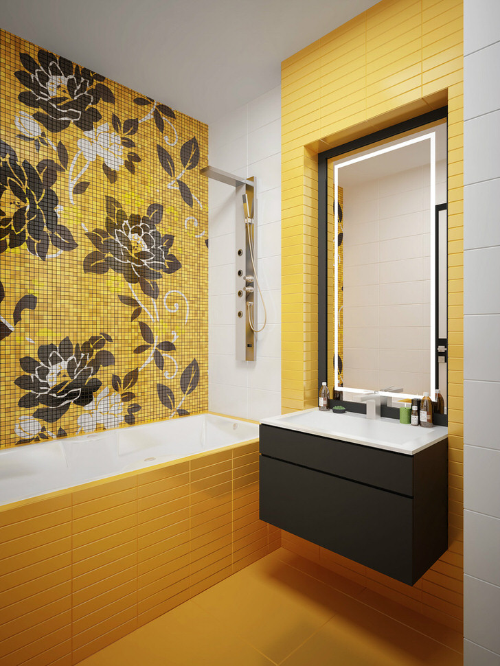 - Ein Badezimmer sieht luxuriös aus, wo die oberen und unteren Teile der Wände um den Umfang mit schwarzen Mosaikfliesen verziert sind, und die Mitte ist mit einem bunten Mosaik in einer sandig-goldenen Palette dekoriert und durch mehrere schwarze Wandstreifen getrennt. Ein solches Finish ist nicht nur schön, sondern korrigiert auch visuell die Proportionen des Raumes.