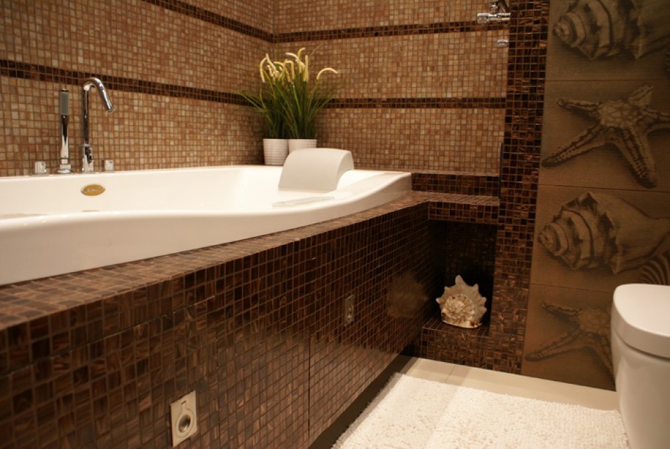 Es ist unmöglich, das nicht zu sagen über zwei exotische Materialien - Kokos- und Bambusmosaikin Bezug auf Holzmosaikbeschichtungen. Die Verwendung von "exotisch" hilft, originelle Innenräume von Badezimmern zu schaffen.