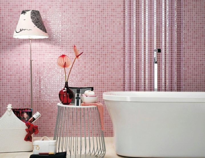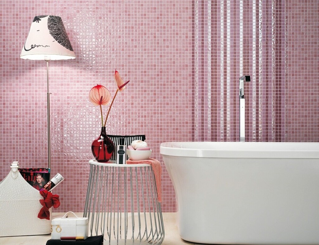 Dekorieren mit rosa Mosaik wird am Morgen viel Positives geben und nach einem anstrengenden Tag Emotionen harmonisieren und Spannungen lösen. Ein rosa Mosaik erhöht die Farbtemperatur im Badezimmer und verleiht dem Raum illusorisch ein Volumen.
