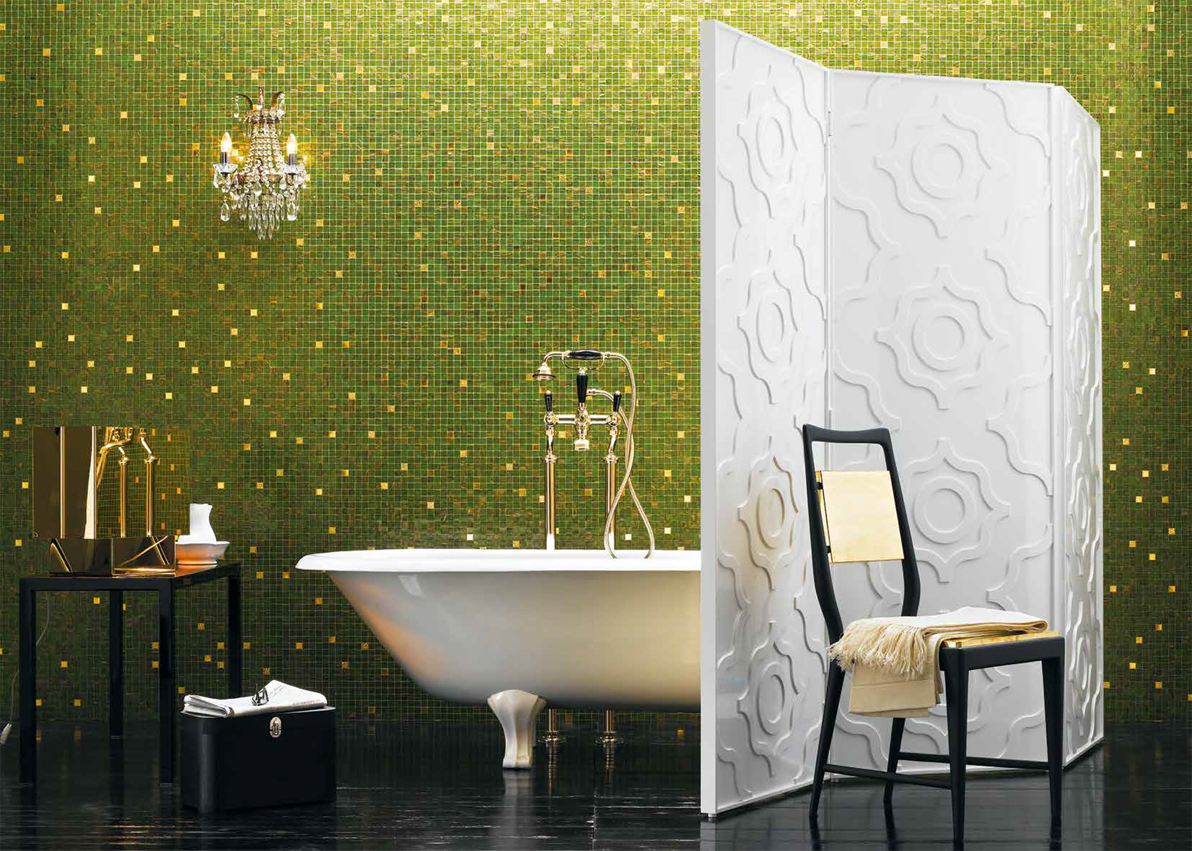 Das Goldmosaik hat eine besondere Energie. Dieses handgefertigte Material verleiht dem Badezimmer einen Glanz, Charme und einzigartigen Charme und schafft dank seines exquisiten Glanzes mit einem schimmernden Effekt ein Gefühl von Luxus.