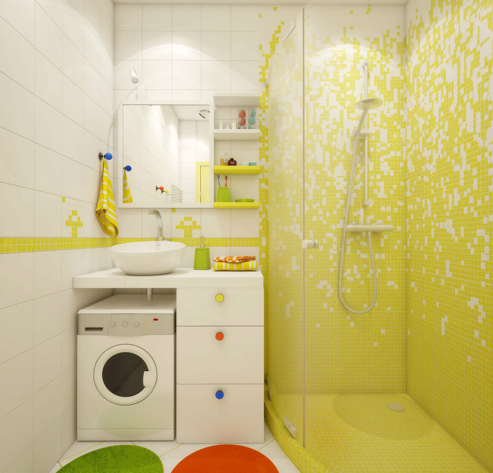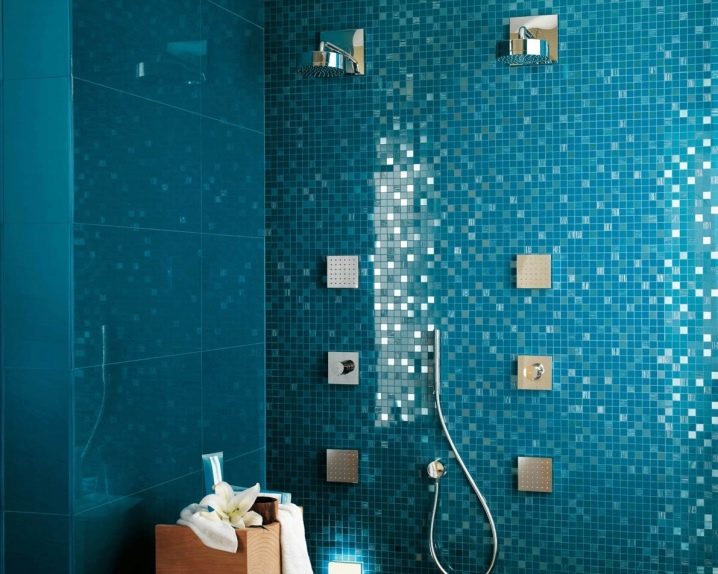 Welche Form der Mosaikfliese vorzuziehen ist, hängt von der gewünschten dekorativen Wirkung ab. Nehmen wir an, dass es sich lohnt, Elemente mit rechteckigem Format und linearem Styling zu verwenden, um der Originalität der Dusche zu entsprechen.Diese einfache Technik verwandelt den Raum überraschend, weil dieses Design frisch und untrivial aussieht.