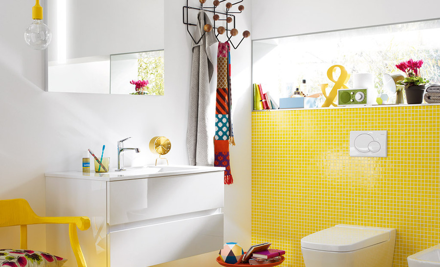 - Praktisches und ausdrucksstarkes Design - ein Mosaik in leuchtenden Farben mit Übergängen von einem einfarbigen Mosaik zu Arbeitsflächen rund um die Badewanne und hinter der Duschkabine in Kombination mit hell gestrichenen Wänden.