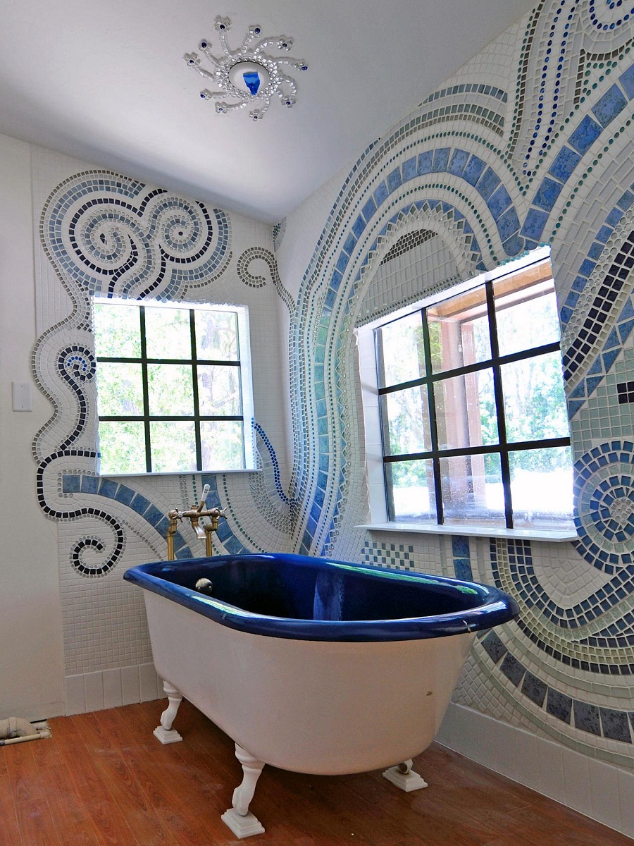 Helle, sehr schöne und elegante Mosaikabdeckung für Badezimmer ist ideal für diejenigen, die das Interieur personalisieren müssen, um es ausdrucksstark und anders als andere zu machen. Schließlich sind die Möglichkeiten von Mosaikfliesen zur Dekoration einer Vielzahl von Oberflächen unabhängig von ihrer Größe oder Form wirklich endlos.