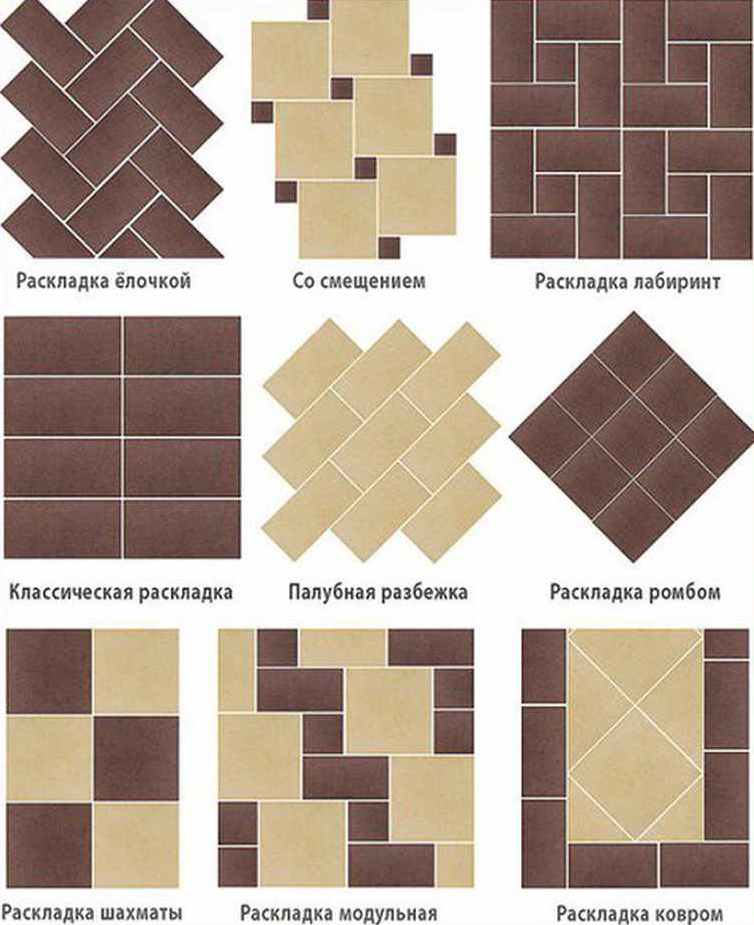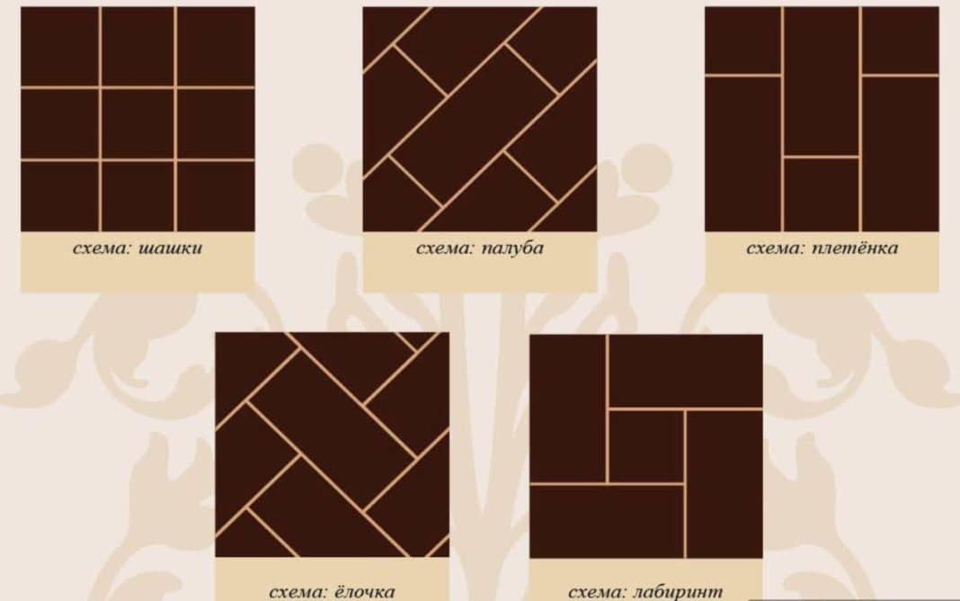 - In Form eines Schachbretts. Der Grundriss ist nach dem Grundschema ausgeführt, aber es ist obligatorisch, eine Mosaikfliese mit kontrastierenden Schattierungen (nicht mehr als zwei) zu verwenden und ohne die Nähte zu verschieben.
