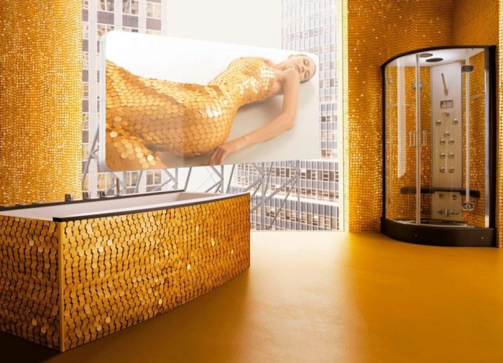 - Badenzum Beispiel, um die Außenseite mit einem Goldflieseneiseneisenbad zu verzieren und dadurch das Design des Raumes zu verändern.