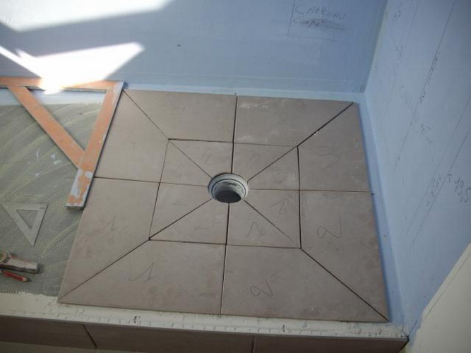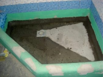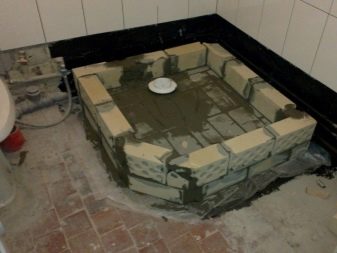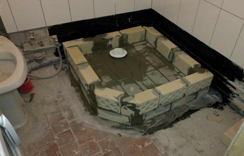 Ziegel können auch auf den Boden der Palette gelegt werden, worauf dann das Drainagesystem montiert wird. Die Palette selbst sollte ca. 25-30 cm hoch sein. Auf einem Ziegelfundament wird dann die zweite Abdichtungsschicht verlegt. Es ist so gemacht, dass es geschlossen war und die Seiten dieser Palette. Ein Bewehrungsnetz wird auf die Abdichtung gelegt und ein Estrich wird aus einer Zementlösung mit Wasser und flüssigem Glas gegossen, was eine zusätzliche Isolierung gegen Feuchtigkeit darstellt. All dies erfolgt mit einer leichten Neigung zum Ablaufloch, um die Wasserstauung in der Pfanne zu beseitigen.