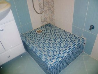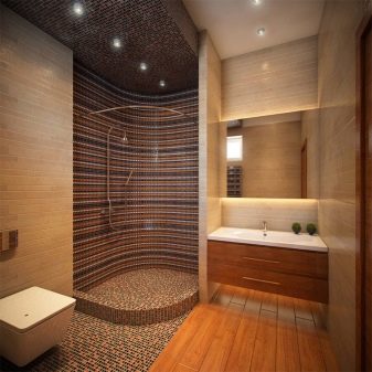 Mosaik, das in der Dusche auf den Boden gelegt wird, verleiht seinem Design zusätzliche Originalität und Einzigartigkeit. Moderne Technologie ermöglicht es Ihnen, Arbeiten an der Fertigstellung des Badezimmers durchzuführen und eine einzigartige Duschkabine auf Kosten der ursprünglichen Fliesen zu geben. Ein Mosaikmuster auf dem Boden und den Wänden der Dusche wird eine sehr nützliche Ergänzung zu seiner Konfiguration sein.