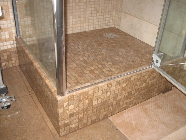 Bei der Herstellung einer Mosaikfliese für eine Duschkabine zum Verlegen sollte auf die Kompatibilität der Beschichtungen geachtet werden, die unter ihrem Rahmen oder ihrer Schale liegen.Ein Betonestrich, Mauerwerk oder Holzuntersetzer sollten nicht unter dem Gewicht eines Mosaiks oder aufgrund von Leim, der bei der Installation verwendet wurde, kollabieren.