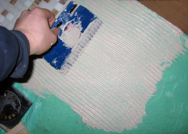 Die Klebstoffzusammensetzung für Mosaikfliesen kann entweder auf Zementbasis oder auf Polymerbasis sein. Seine Wahl hängt von der Oberflächenstruktur für die Verlegung des Mosaiks ab, und die Farbe dieses Klebers kann grau sein, mit einem Hauch von gewöhnlichem Zementmörtel oder weiß. Wenn entschieden wird, eine Duschkabine in hellen Farben anzuordnen, dann ist es besser, weißen Kleber dafür zu verwenden. Dies liegt daran, dass sich Mosaikelemente im Vergleich zu Keramikfliesen durch eine gewisse Transparenz auszeichnen, daher verleiht grauer Leim einer Mosaikfläche eine dunklere Nuance.