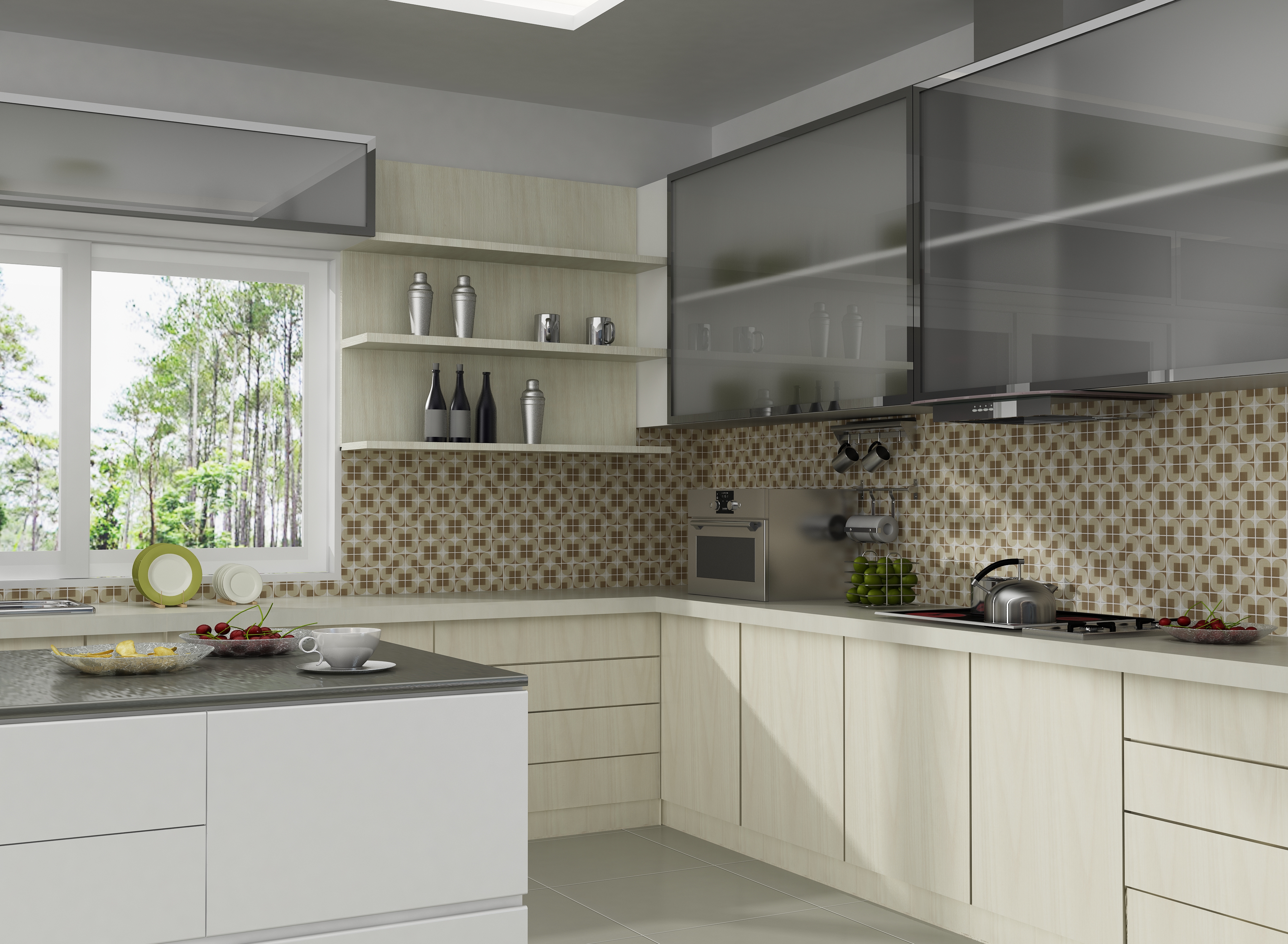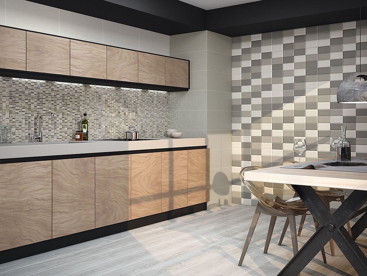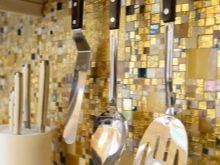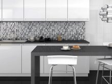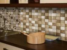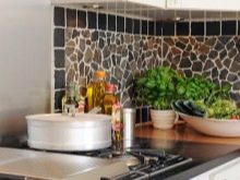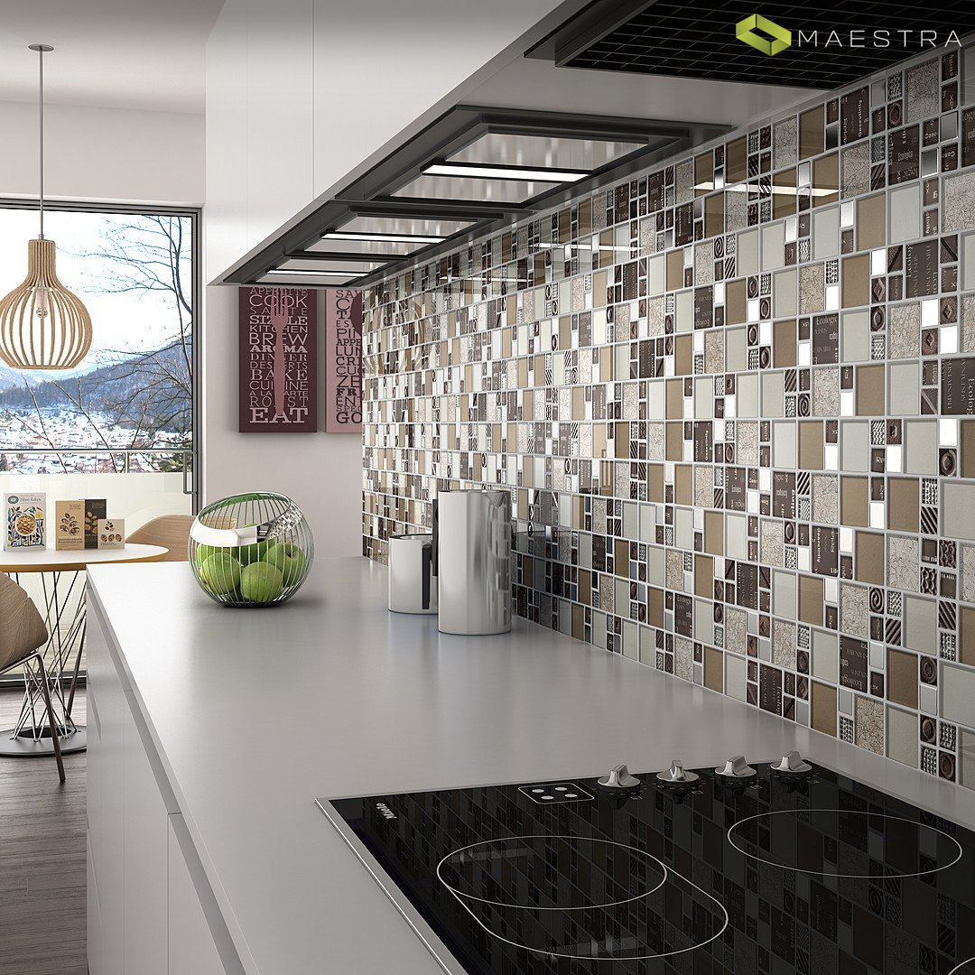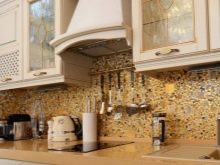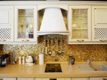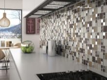 Bei der Mosaikküche sollte besonders auf die Küchenschürze geachtet werden - Dies ist der offene Teil der Wand zwischen der Tischplatte und den Wandschränken, so dass sich die Verdampfungsprodukte während des Kochens auf dieser Oberfläche ablagern. Um Spuren von Fett und anderen Sedimenten zu verbergen, werden keramische Mosaikfliesen mit Farbverstreckung verwendet, mit Graustufen von grau-braunen Farbübergängen.