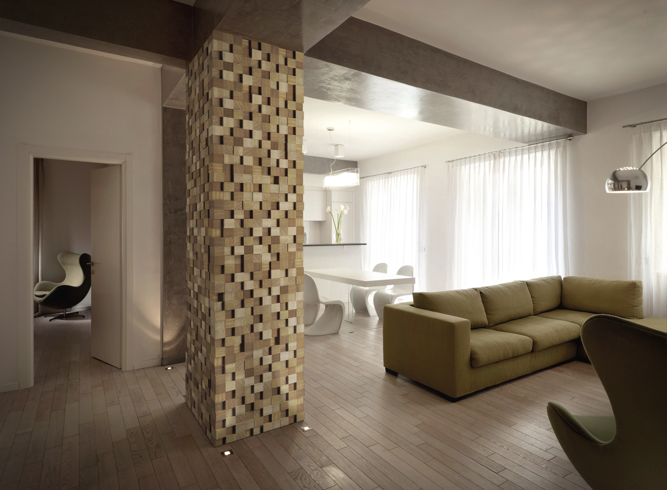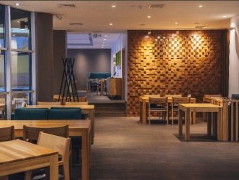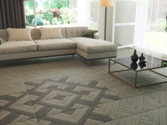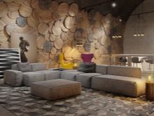 Moderne Designer praktizieren die Dekoration der Räumlichkeiten, indem sie Boden- und Wandmosaik-Leinwände aus Naturstein und Mosaikfliesen aus teuren Hölzern herstellen, die mit einer feuerfesten und feuchtigkeitsdichten transparenten Hülle überzogen sind. Dies betont die natürliche Struktur von Stein und Holz, manchmal getrennt durch Einsätze aus Metall und Knochen. Das Design eines Raumes, der auf ähnliche Weise hergestellt wurde, wirkt unaufdringlich, aber luxuriös.