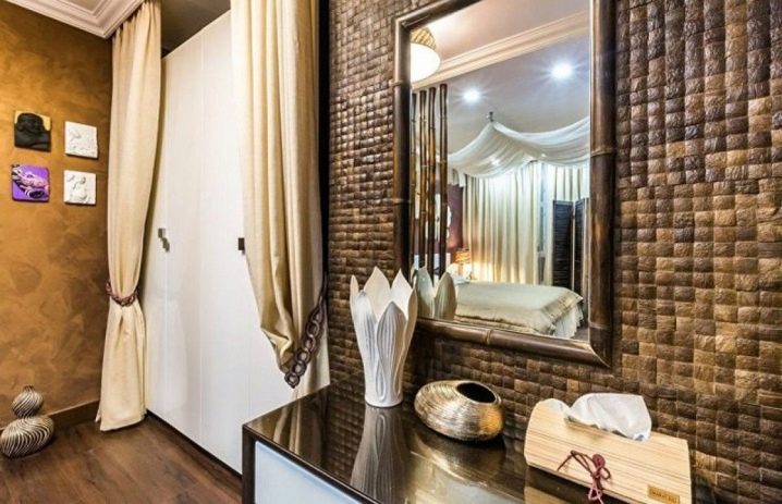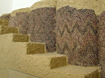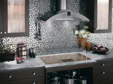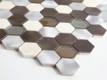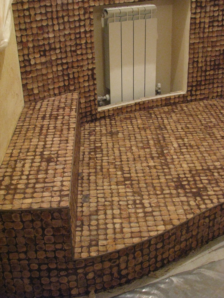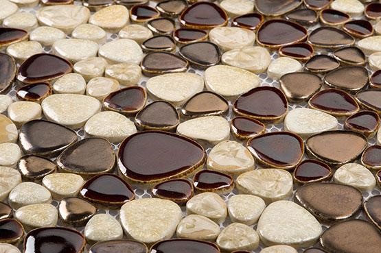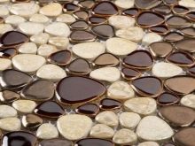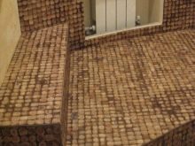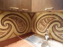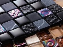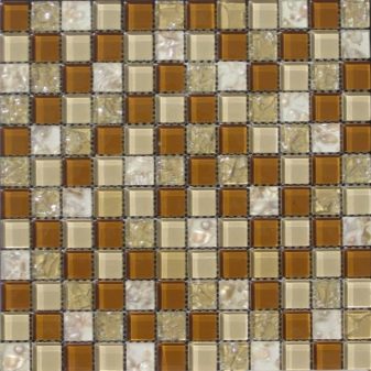 Das Mosaik, das aus der Schale der Kokosnuss oder der Kiefermutter gelegt ist, sieht reich aus. Nutshell hat eine sehr hohe Festigkeit, Feuchtigkeitsbeständigkeit und Beständigkeit gegen Temperaturextreme. Facing Tiles auf der Grundlage dieses Materials werden durch Laserschneiden zu geraden Quadraten verarbeitet. Diese Quadrate sind mit natürlichen Harzen verbunden.