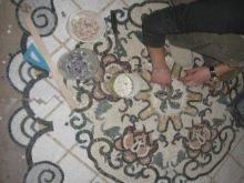 Zu den selten verwendeten Materialien gehört die Eierschale, die verwendet wird, um der Steinwand Alterung in Form von Rissen zu verleihen und die Blüte zu imitieren, während die Teile der Schale mit vielfarbigem Email bedeckt werden.