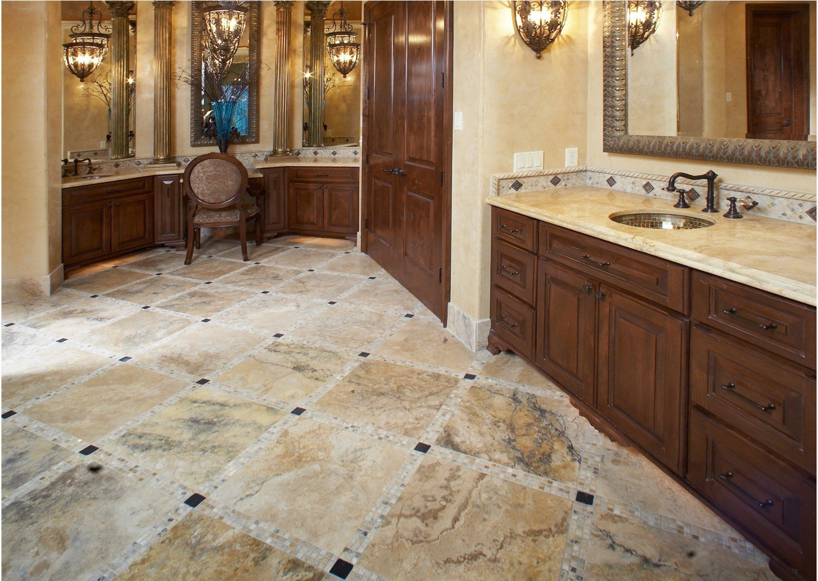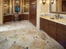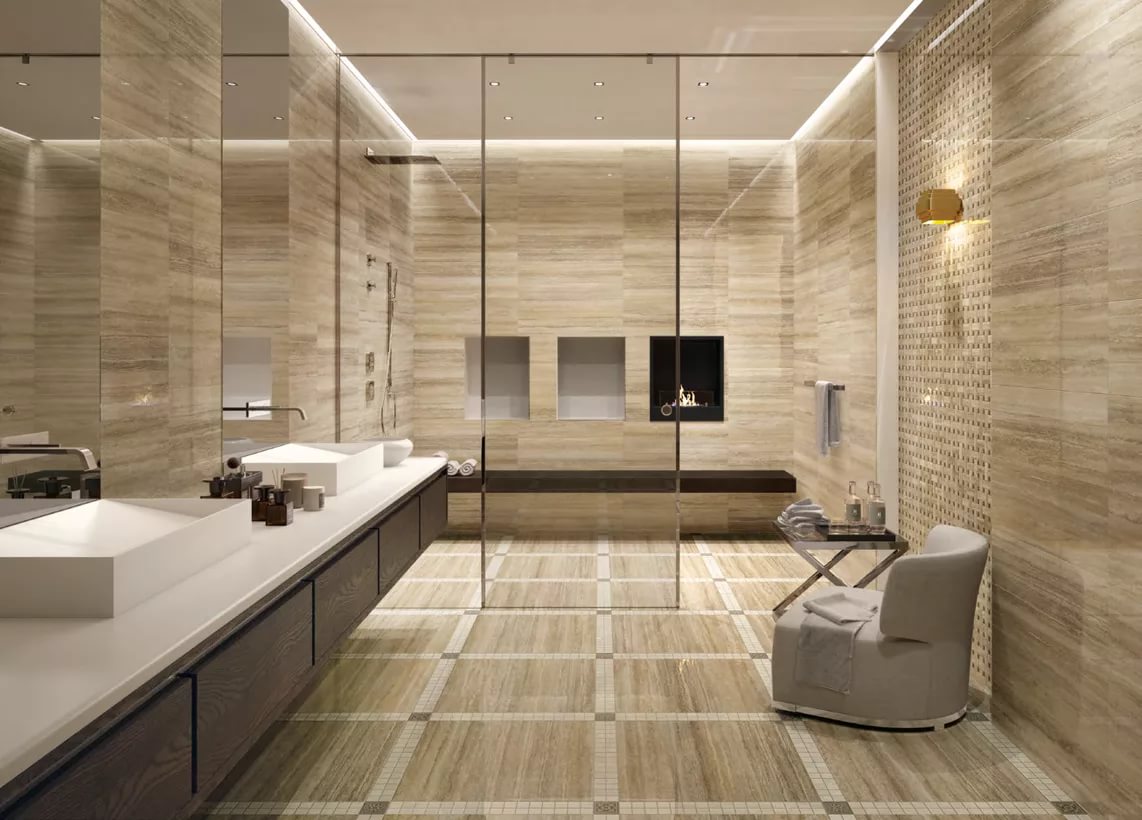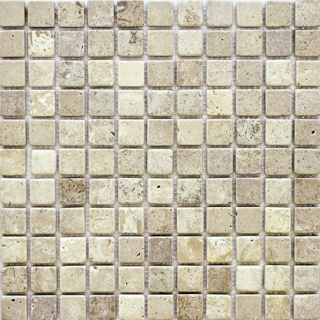 Bei der Verwendung von Travertin im Bodenbelag wird es einer speziellen Imprägnierung unterzogen, um die Porosität zu verringern und die Haltbarkeit zu erhöhen. Travertin kann sowohl glänzende als auch matte Oberflächen haben. Das Travertin-Mosaik besteht hauptsächlich aus quadratischen Steinfliesen.
