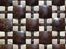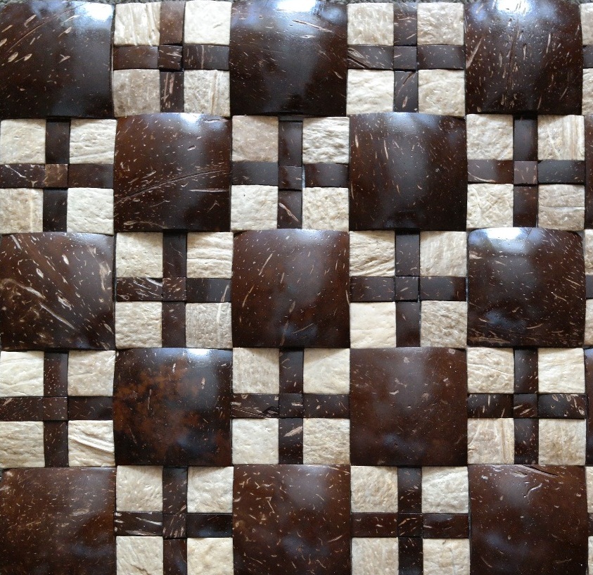 In letzter Zeit ist das sogenannte Kokosmosaik sehr interessant geworden. Das Interesse der Meister ist aufgrund seiner Haltbarkeit, Schönheit und Langlebigkeit zu diesem exotischen Material geweckt worden. Rechteckige Kokosnuss-Chips werden aus Kokosnuss-Scherben hergestellt. Die ausgeschnittenen Fragmente sind durch natürliche Harze miteinander verbunden, was dem Produkt eine vollständige ökologische Reinheit verleiht.