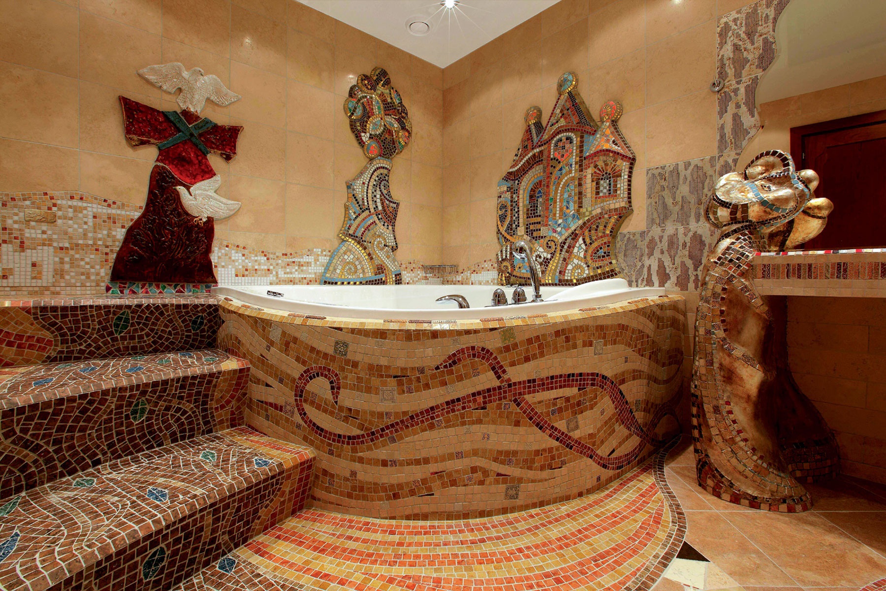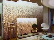 Die Innenausstattung, die mit Mosaiken verziert ist, sieht im Vergleich zu einfachen Keramikfliesen und Wandpaneelen am elegantesten aus. Das Mosaik wird sowohl in Form von Wand- und Bodenbelägen als auch in Kombination mit anderen Veredelungsmaterialien harmonisch mit ihnen kombiniert.Seine Verwendung ist nicht nur eine Art Maß für das Wohlergehen und den Erfolg des Besitzers, sondern zeigt auch seine ästhetischen Vorlieben, die für viele Jahre auf eine allgemeine Überprüfung ausgelegt sind.