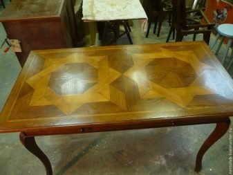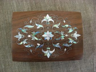 Das Mosaik aus Holzmaterial steht in guter Harmonie mit verschiedenen Metalleinsätzen, sowohl in Form von Trennplatten als auch als separate Verbundfragmente. In diesem Fall werden in der Regel Silbermetallfragmente vor dem Hintergrund von hellem Holz verwendet. Kupfer, Messing und Bronze werden auf dem Hintergrund dunkler Holztexturen verwendet. Das Steinmosaik ist ebenfalls nach dem gleichen Farbprinzip aufgebaut.