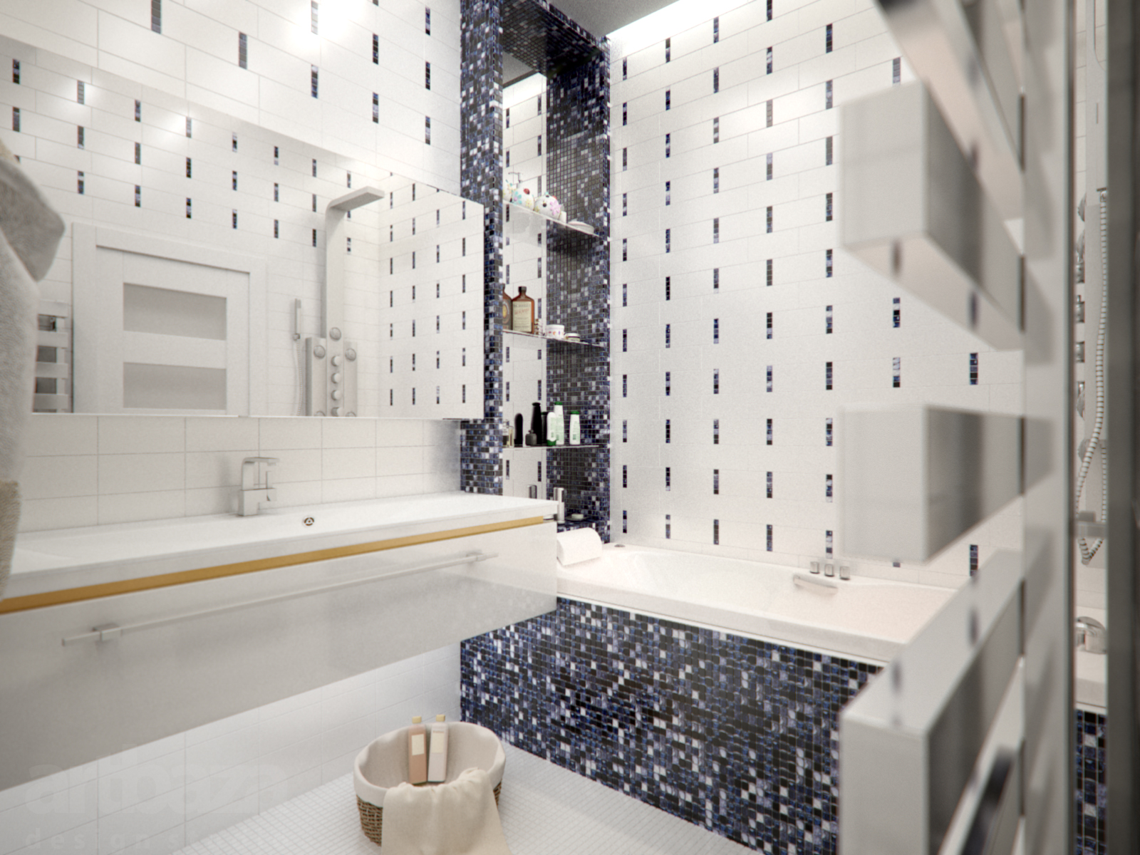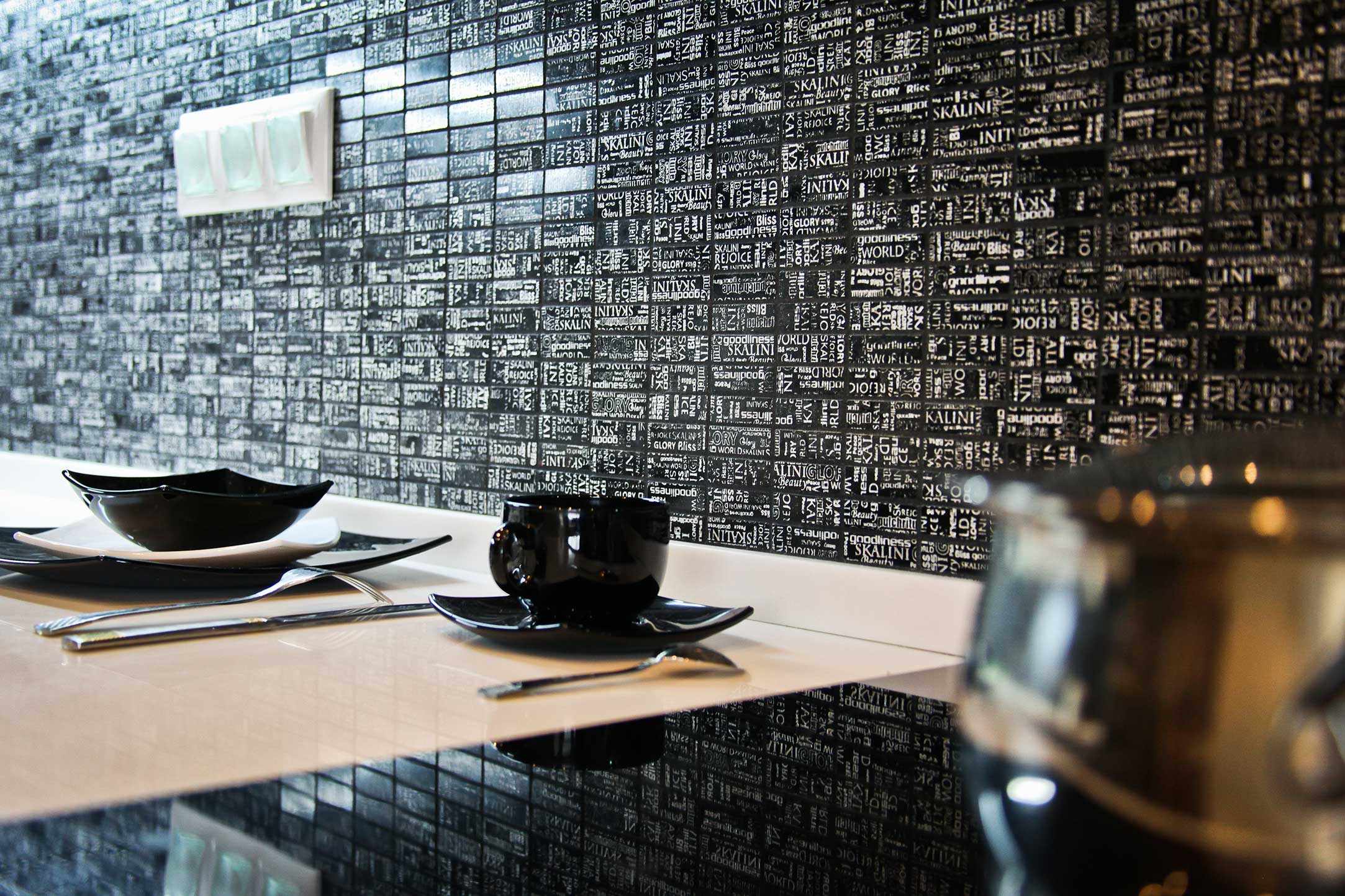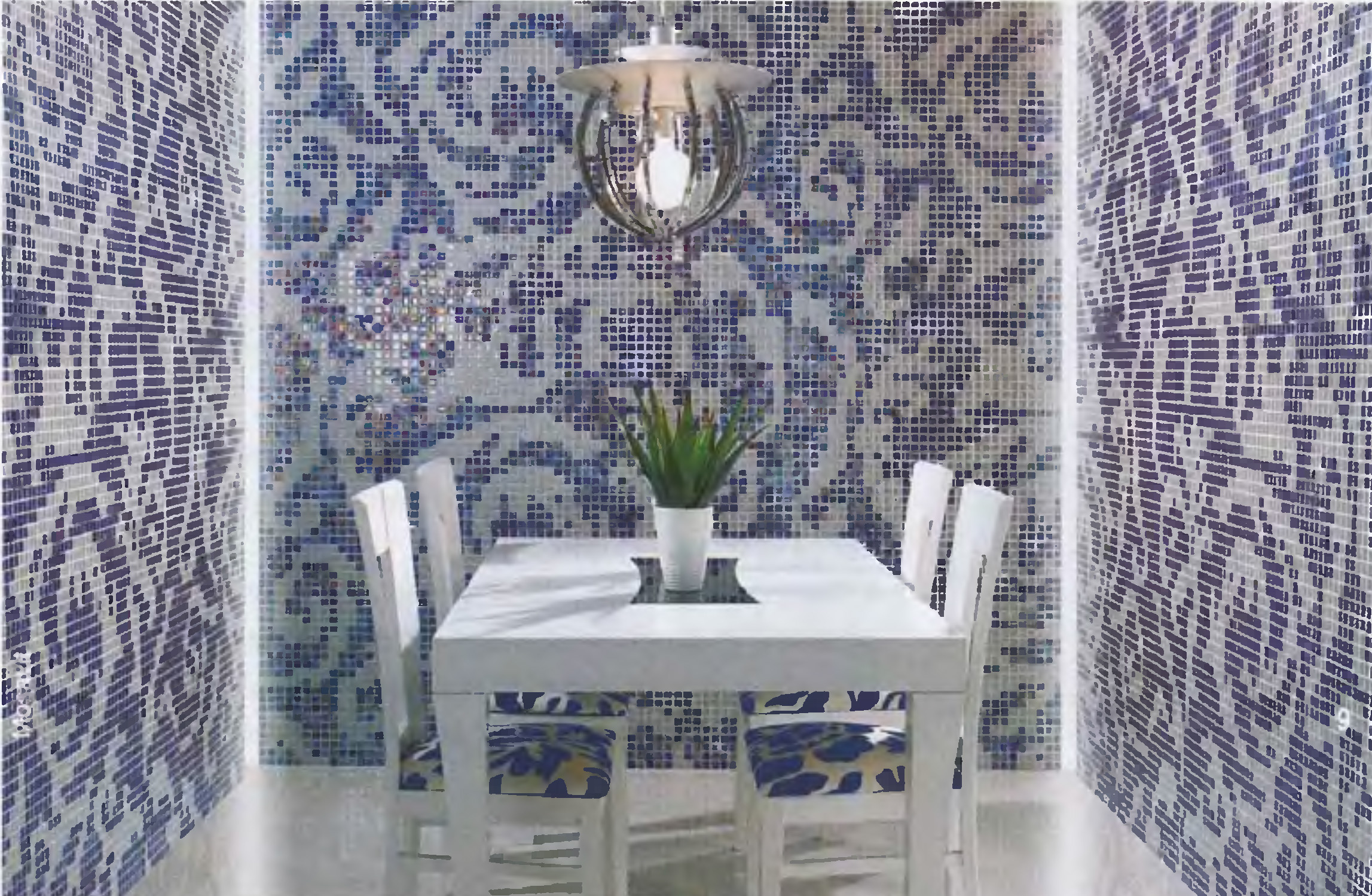 Bei der Auswahl der Farben für bestimmte Räume ist außerdem die Beleuchtung dieser Räume während des Tages und der Nacht zu berücksichtigen. Es muss daran erinnert werden, dass die gleiche Farbe mit natürlichem und künstlichem Licht verschiedene Eigenschaften sichtbar machen kann. Das Mosaikmuster in leuchtenden Farben, überlagert auf einer Ecke oder Leiste, glättet optisch Unregelmäßigkeiten. Aus diesem Grund scheint jeder Raum geräumiger zu sein.
