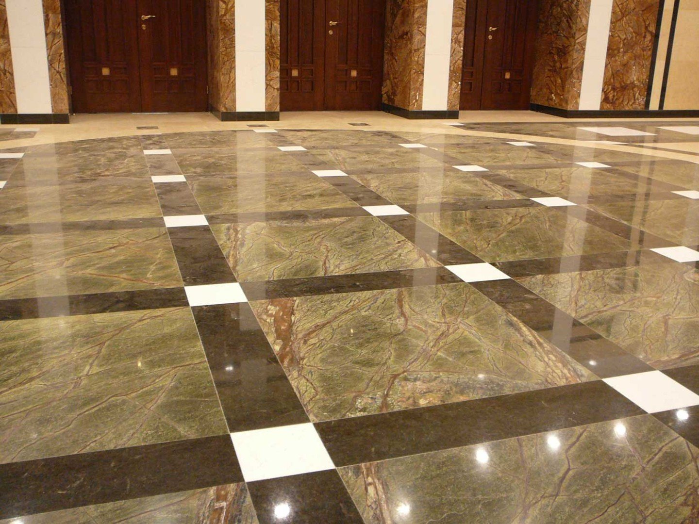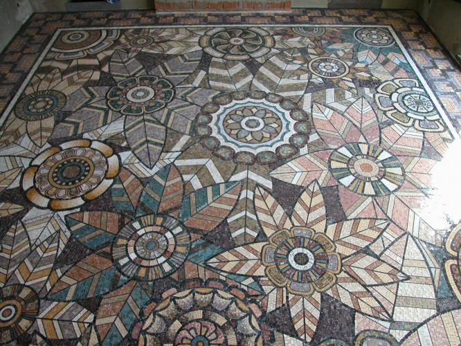 Für den Bodenbelag werden die gleichen Methoden verwendet wie im modernen venezianischen Mosaik "Terrazzo". Es ist eine Zementmischung mit Steinsplittern und zerbrochenem Flaschenglas, wo Granit- und Marmorfragmente hinzugefügt werden.Nach dem Aushärten erhält man eine sehr wasserfeste Oberfläche mit einem Mosaikmuster, das poliert werden soll.