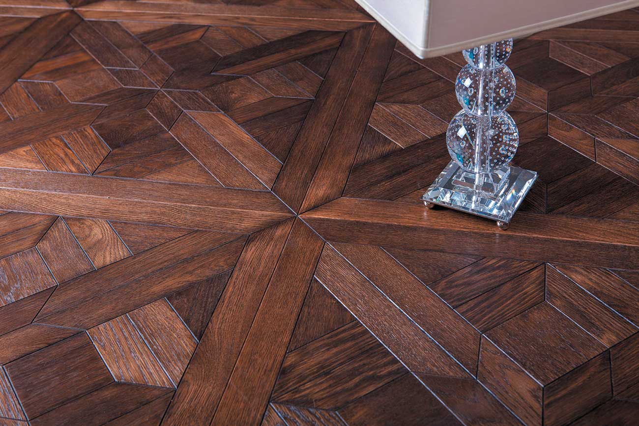Bei dieser Art der Verlegung werden oft Smal- und Massivholz verwendet.Darüber hinaus werden häufig Metalleinsätze wie Kupfer, Messing und Bronze praktiziert.