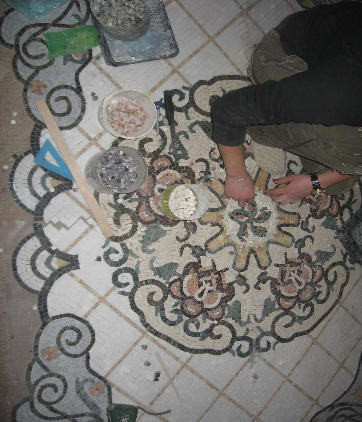 Mosaizisten verwenden oft zerbrochenes Flaschenglas und Fragmente von Steinen unterschiedlicher Konfigurationen für individuelle Kreativität. Der Prozess ist sehr mühsam, bietet aber die Möglichkeit zur Selbstdarstellung und vermeidet die üblichen Klischees.