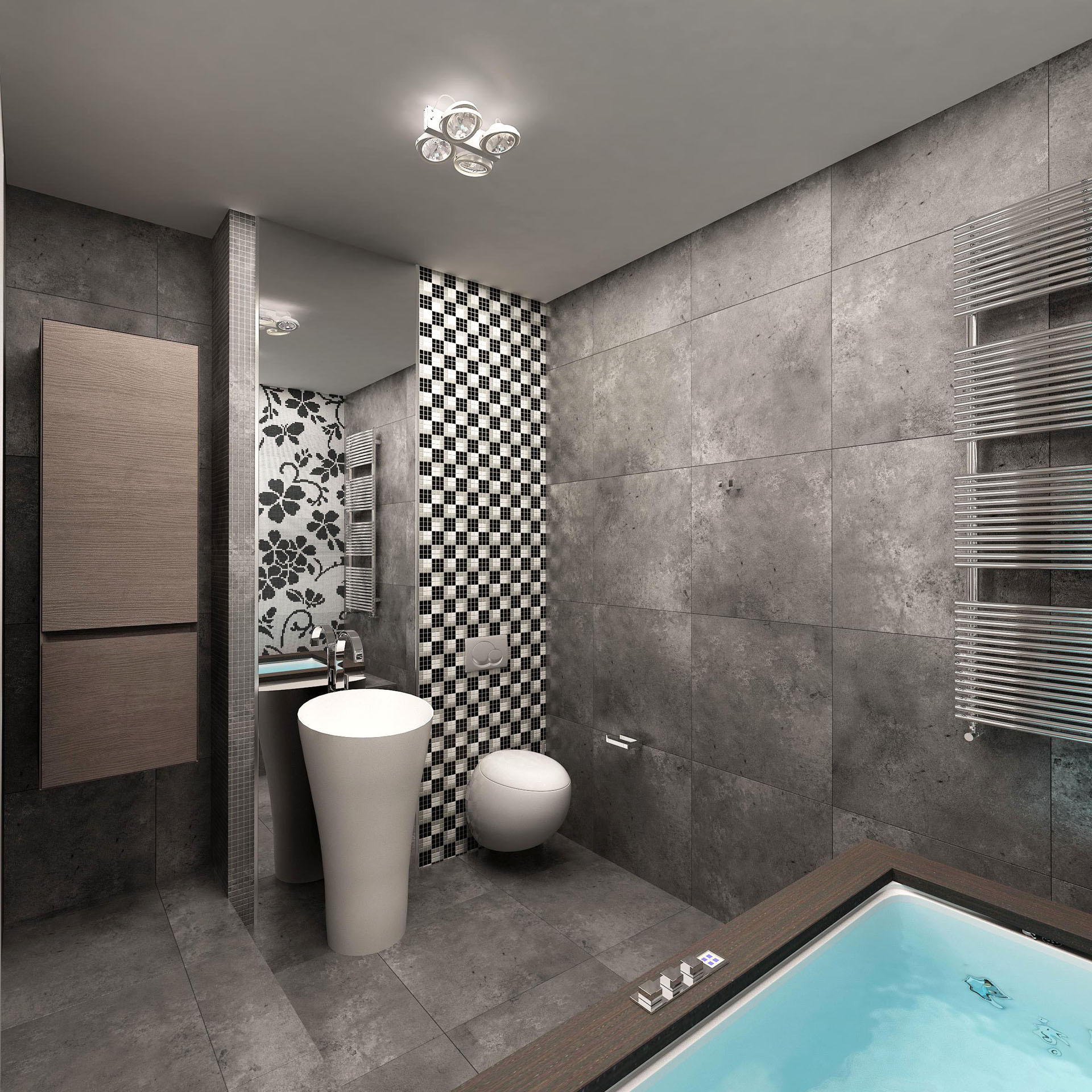 Ein gutes Beispiel ist die Kombination der Oberfläche eines Musters mit einem matten beige oder türkisfarbenen Hintergrund, der in reichen Marinetonalitäten glänzend ist. In dieser Kombination machen sich oft die Bäder und Küchen aus.