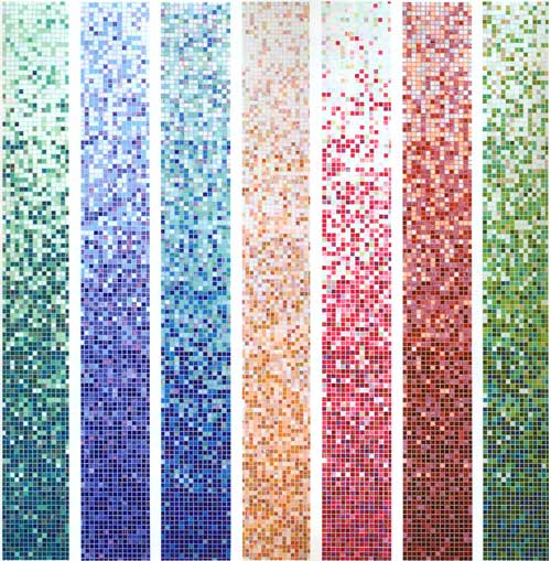 Mosaikfliesen werden auf dem Verbrauchermarkt in verschiedenen Formen und Sätzen verschiedener Formen hergestellt, die in einem einzigen Thema verbunden sind. Designideen werden überall in Bewegung gesetzt. Eine dieser im Leben verkörperten Ideen dehnt sich aus. Mosaic Stretching zielt darauf ab, ein Bildvolumen zu erzeugen, indem es sich sanft von einer dunklen Farbe zu einer hellen bewegt.