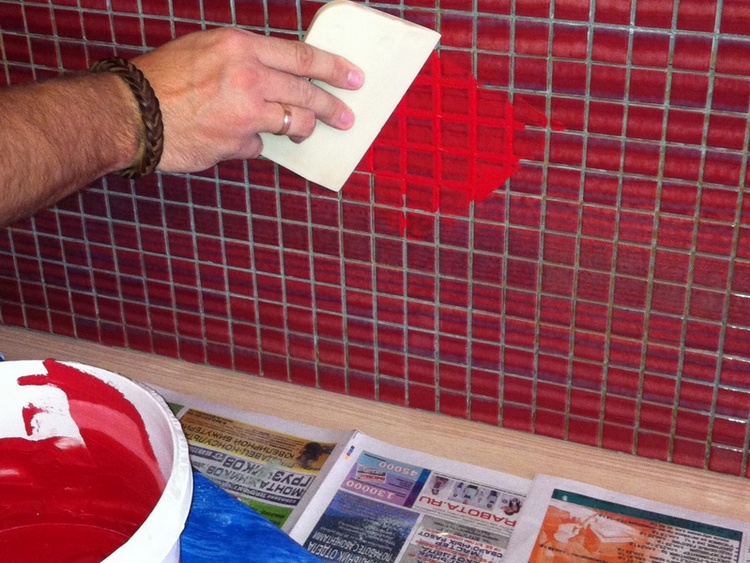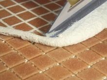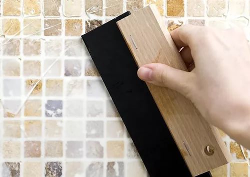 - Bevor Sie mit dem Verfugen beginnen Die Oberfläche muss gründlich gereinigt werden von Schmutz und Staub. Es ist möglich, mit der Arbeit nur 24 Stunden nach dem Verlegen der Fliesen zu beginnen. Dies ist notwendig, damit das Mosaik richtig gefroren ist und das Glätten die Beschichtung nicht beschädigen kann, da sonst Feuchtigkeit die Farbe der Fugen beeinflussen kann.