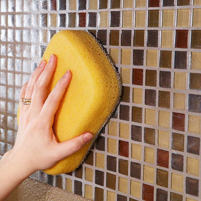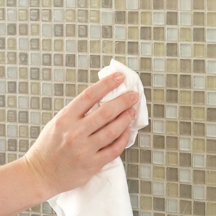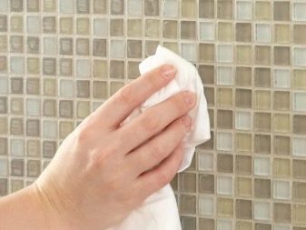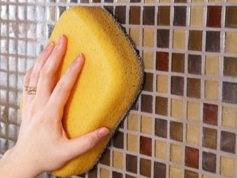 - Verwenden Sie weiche kreisförmige Bewegungen, um überschüssigen Mörtel vom Mosaik zu entfernen. Es ist besser, die Fliese mit einem weichen Tuch oder Schwamm zu waschen und regelmäßig in sauberem Wasser zu waschen. Sie sollten nicht hart auf die Fliese drücken, um die Integrität der Beschichtung nicht zu beschädigen. Nachdem der Mörtel vollständig getrocknet ist, sollte die gesamte Beschichtung mit einem trockenen Tuch oder einem Hydroschwamm abgewischt werden.