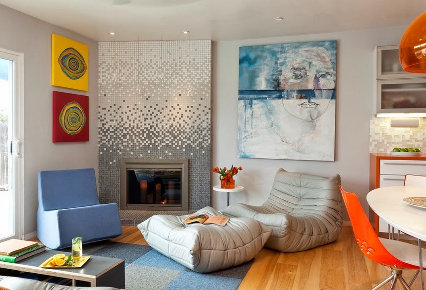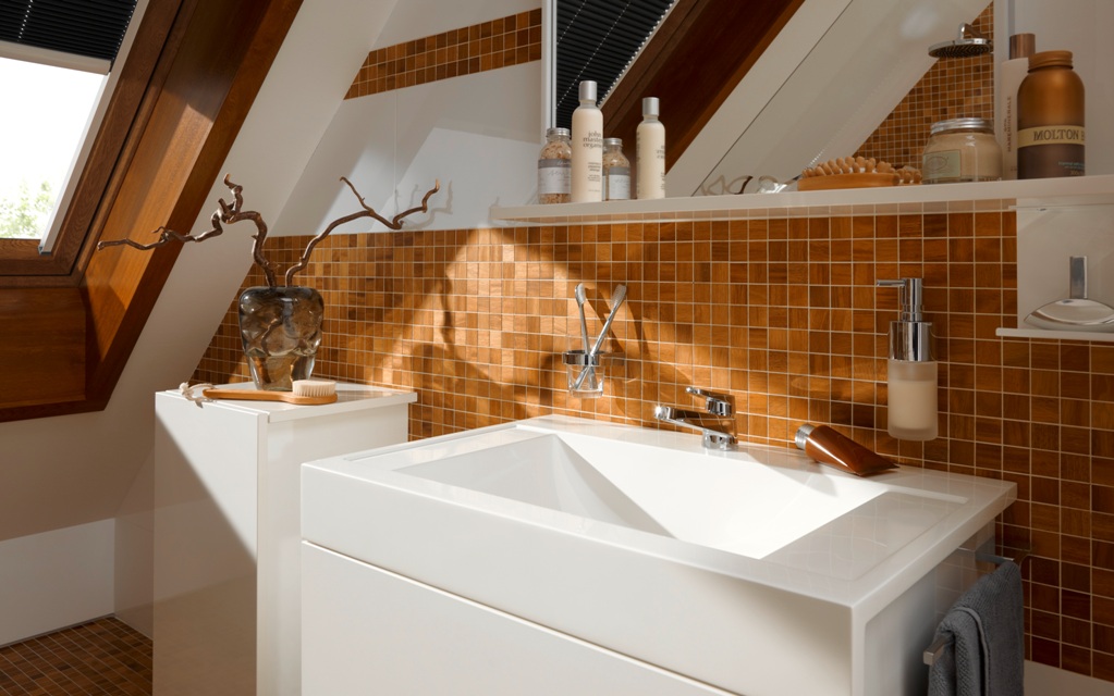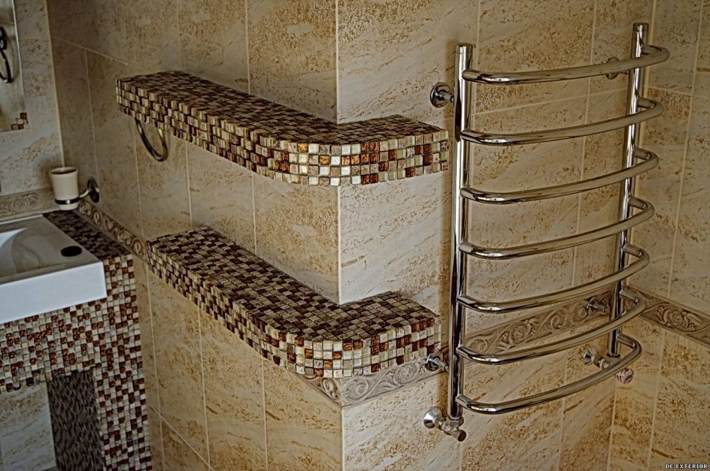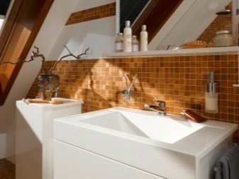 - Kompositionen von hellen Tönen verschmelzen visuell mit dem Mosaik, und die Oberfläche scheint gegossen zu sein. Dies ist eine großartige Möglichkeit, die nicht perfekte Fliese zu verstecken.