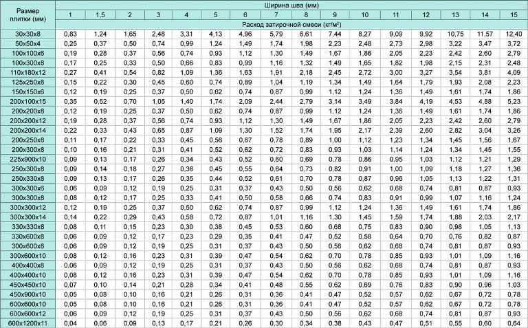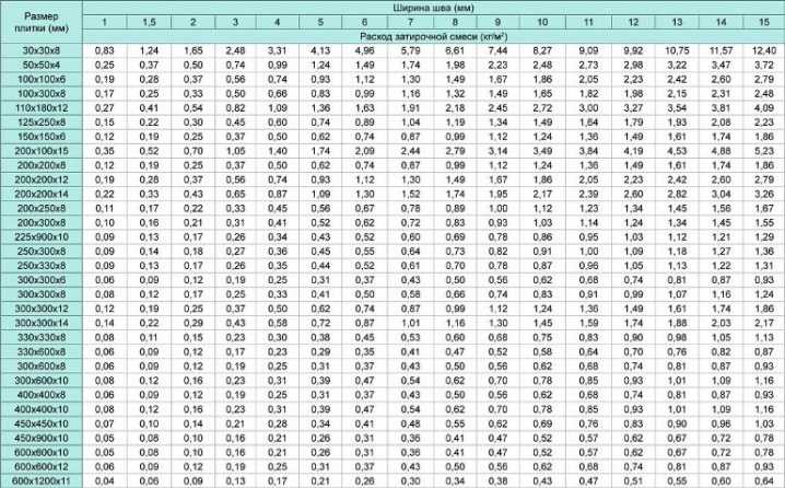 In ähnlicher Weise können Sie den Verbrauch von Fugenmasse berechnen, nicht nur für das Mosaik, sondern auch für die üblichen Fliesen. Wenn Sie sich nicht mit den Berechnungen beschäftigen möchten, können Sie die Standards der Hersteller verwenden, die auf der Verpackung jeder Kelle angegeben sind.