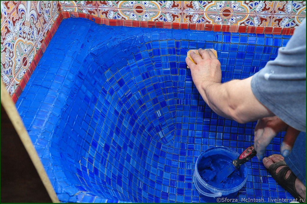 - Damit der Fugenmörtel besser wird und keine Feuchtigkeit verliertund die Nähte sind glatt und ordentlich, die Kanten des Mosaiks können leicht nass sein. Wenn Bedenken bestehen, dass die Fliese während der Arbeit beschädigt werden kann, wird empfohlen, die Oberfläche mit einer speziellen Schutzmischung zu behandeln. Wenn die aufgetragene Mischung zu trocknen beginnt, können Sie die Oberfläche mit einem feuchten Schwamm befeuchten oder leicht mit einer Sprühflasche bestreuen.