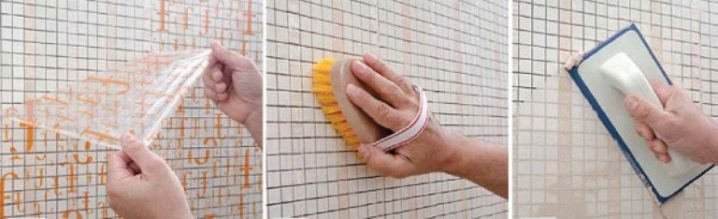 - Wenn Sie leichten Fugenmörtel verwendenDie Vertiefungen zwischen den Fliesen müssen vollständig sauber sein. Das dekorative Mosaik kann mehrmals gereinigt werden und nach jeder Reinigung austrocknen. Um zu verhindern, dass der Mörtel nach dem Trocknen reißt, wird empfohlen, die Fliese mit einem Schwamm zu benetzen, der überschüssige Feuchtigkeit entfernt.