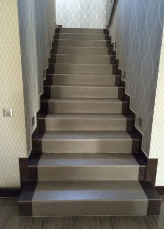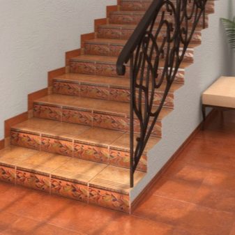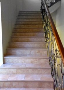 Traditionell können Sie die Treppe mit rechteckigen oder quadratischen Keramikplatten auslegen, aber diese Lösung ist bei modernen Designern nicht beliebt. Heute stellen Hersteller von keramischen Produkten fertige Sets für die Endbearbeitung von Treppen her, deren Parameter nicht in veraltete Standards passen.