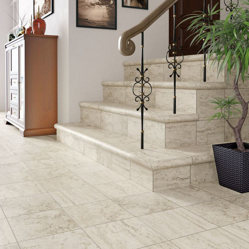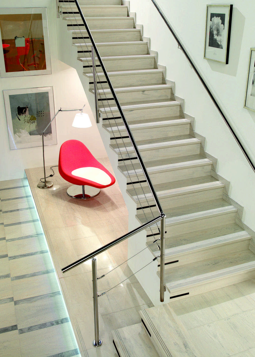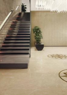 Zusätzlich zu den oben genannten, sollten Verkleidungsplatten für Treppen schön, aber unprätentiös in der Pflege sein. Eine spezielle gewellte Beschichtung kann das Trauma reduzieren. Wählen Sie daher eine Kachel aus Es sollten bevorzugte Modelle mit rutschfester, rauer Oberfläche sein.