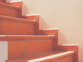 - Keramik mit einer sicheren Kante. Gebrauchte Modelle mit einer geriffelten Kante, die ein Abrutschen beim Gehen verhindert. Das Verlegen der Fliese erfolgt am Rand der Lauffläche mit dem Überstand, daher ist es wichtig, dass der Überstand des Produkts der Dicke des Steigrohrs entspricht.Meistens ist die Kante der Produkte abgerundet, was der Treppe einen besonderen Charme verleiht. Diese Auskleidungsoption wird für Innen- und Außentreppen verwendet.