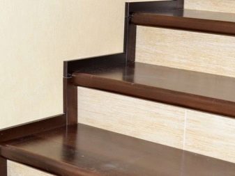 - Cover für Schritte. Wenn die Leiter täglich verwendet wird und starken Belastungen ausgesetzt ist, werden für die Verkleidung normalerweise austauschbare Profile auf einer Metallbasis verwendet. Die untere rutschfeste Schicht wird mit Schrauben am Fuß der Stufen verschraubt. Und die Spitze, aus Kunststoff PVC ist austauschbar und ist eine gewellte Beschichtung. Meistens wird das Futter verwendet, wenn Sie eine praktische Beschichtung auf der Treppe erstellen müssen.Sie eignen sich am besten für die Dekoration von vertikalen Kanten, Treppen im Badezimmer und in der Küche. Bei Verwendung einer Ziegelverkleidung werden spezielle Fliesenmodelle angewendet. Die Oberflächenfarben können einfarbig, mehrfarbig oder mit Nachahmung eines Natursteinmusters sein. Effektiv in den Innenprofilen mit einer kontrastierenden Farbe schauen.