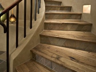Zur Auskleidung interner Strukturen verwenden Keramikfliesen. Normalerweise nehmen Sie ein Modell mit einem speziellen Schnitt entlang der Kanten oder der gemusterten Kante. Solche Produkte ähneln Keramikgranit, aber mit ihrer Hilfe ist es unmöglich, eine monolithische Beschichtung herzustellen. Aber die Kombination mehrerer Schattierungen für den Blick auf die Treppe verleiht der gesamten Struktur eine spektakuläre Wirkung.